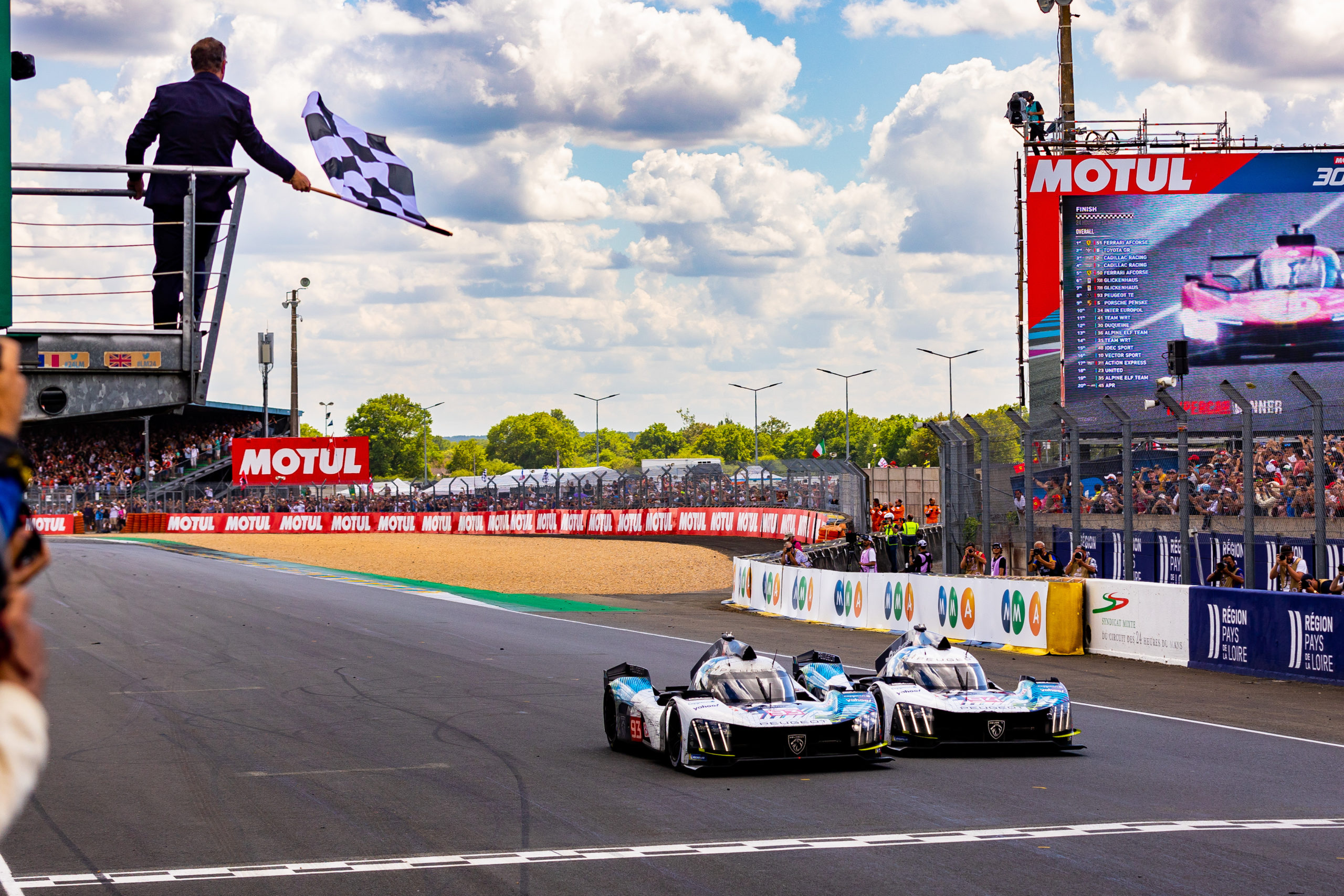 Au terme des 24 heures de course, et pour marquer son retour, les deux hypercar Hybride-Electrique du Team Peugeot TotalEnergies ont franchi le drapeau à damiers à la 8e (#93) et la 12e (#94) place de la catégorie Hypercar.