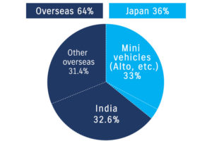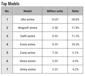 Fin août 2023, Suzuki a passé la barre symbolique des 80 millions de voitures vendues dans le monde depuis la création de l’entreprise. 28,9 millions d’entre elles ont été commercialisées au Japon et 51,27 millions d’unités sur le reste de la planète. Depuis la création de l’activité automobile de la Marque, le Japon a représenté 36 % des ventes, l’Inde 32,6 %, l’Europe 10 %, l’Asie 13,5 % et les autres régions (Amérique latine, Océanie, Moyen-Orient, Afrique, etc.) 7,8 %.