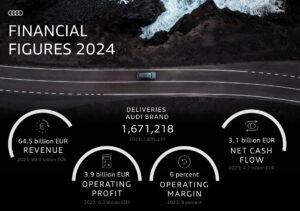 Ingolstadt, Mardi 18 mars 2025 – Le groupe Audi termine l’exercice 2024 sur de solides résultats malgré un environnement de marché complexe. Sur les douze derniers mois, le chiffre d’affaires atteint 64,5 milliards d’euros, le bénéfice d’exploitation 3,9 milliards d’euros et la marge d’exploitation 6 %. Le flux de trésorerie net se monte à 3,1 milliards d’euros. En 2025, Audi tiendra ses promesses et présentera de nouveaux modèles. D’ici à la fin de l’année, l’entreprise sera dotée du portefeuille produits le plus récent du paysage concurrentiel.