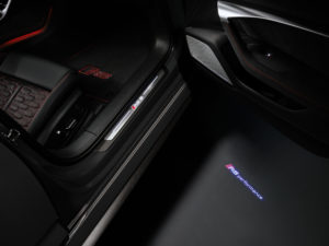 Au sein de l’habitacle, les packs design RS gris et rouge ont été étendus au bleu. Le volant en Alcantra noir présente des surpiqûres contrastantes en bleu Mercato, tandis que les tapis de sol, le côté de la console centrale et le sélecteur de vitesse sont également dotés de surpiqûres contrastantes bleues. Les ceintures de sécurité sont de couleur bleu océan et les incrustations décoratives sont en carbone avec des éléments bleus en option. Le sélecteur de vitesse et le côté de la console centrale sont en microfibre Dinamica, qui se compose d’environ 45 % de fibres PET recyclées, et les sièges sport sont dotés d’un revêtement en cuir Valcona de haute qualité, perforé avec des surpiqûres en nid d’abeille contrastantes bleu Mercato. Un autre élément distinctif est une diode d’entrée dans les portes avant qui projette le lettrage « RS performance » sur le sol à côté de la voiture.