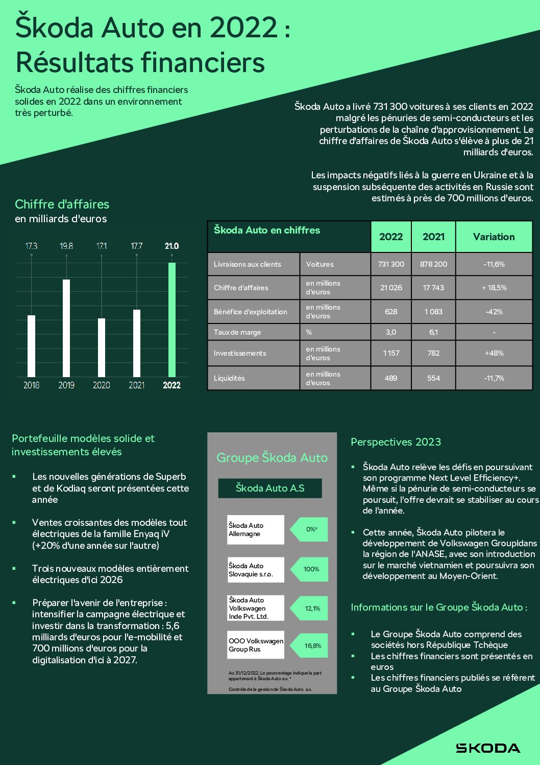 Mladá Boleslav, 16 mars 2023 – Le Groupe Škoda Auto1) a livré 731 300 véhicules dans le monde en 2022 et a augmenté son chiffre d’affaires en glissement annuel de +18,5% pour atteindre 21 milliards d’euros (2021 : 17,7 milliards d’euros). L’environnement de marché est resté difficile en raison de la pénurie de semi-conducteurs, des problèmes persistants des chaînes d’approvisionnement et d’une augmentation substantielle des prix des matières premières. Grâce à des contre-mesures efficaces, le constructeur automobile est parvenu à dégager un bénéfice d’exploitation positif de 628 millions d’euros (2021 : 1,083 milliard d’euros ; -42%). Ce résultat a été obtenu malgré le poids financier conséquent de la guerre en Ukraine, et de l’arrêt des activités de Škoda en Russie en mars dernier. La perte liée à l’arrêt des activités sur ce qui était alors le 2ème marché en volumes de Škoda Auto est estimée à près de 700 millions d’euros. Par conséquent, le rendement des ventes qui aurait légèrement dépassé les 6,1% l’année dernière a chuté à 3% dans ce contexte extraordinaire. Malgré les défis actuels, Škoda continue d’être financièrement solide, de développer son internationalisation et d’investir massivement dans l’électromobilité et la digitalisation.