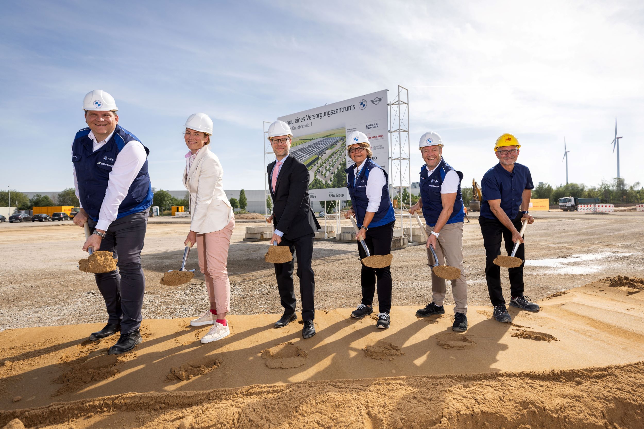 To mark the start of construction of the Supply Centre North, Petra Peterhänsel, Plant Director, Jens Köhler, Works Council Chairman, Frank Hager, Head of Production for High-Voltage Batteries, Clemens Schülke, Mayor and Alderman for Business, Labour and Digital in the City of Leipzig and Anja Hähle-Posselt, Director of the Office for Economic Development of the City of Leipzig, were joined by Karsten Dickerboom, representing the construction company Max Bögl Stiftung & Co KG, to perform the symbolic turning of the first sod.