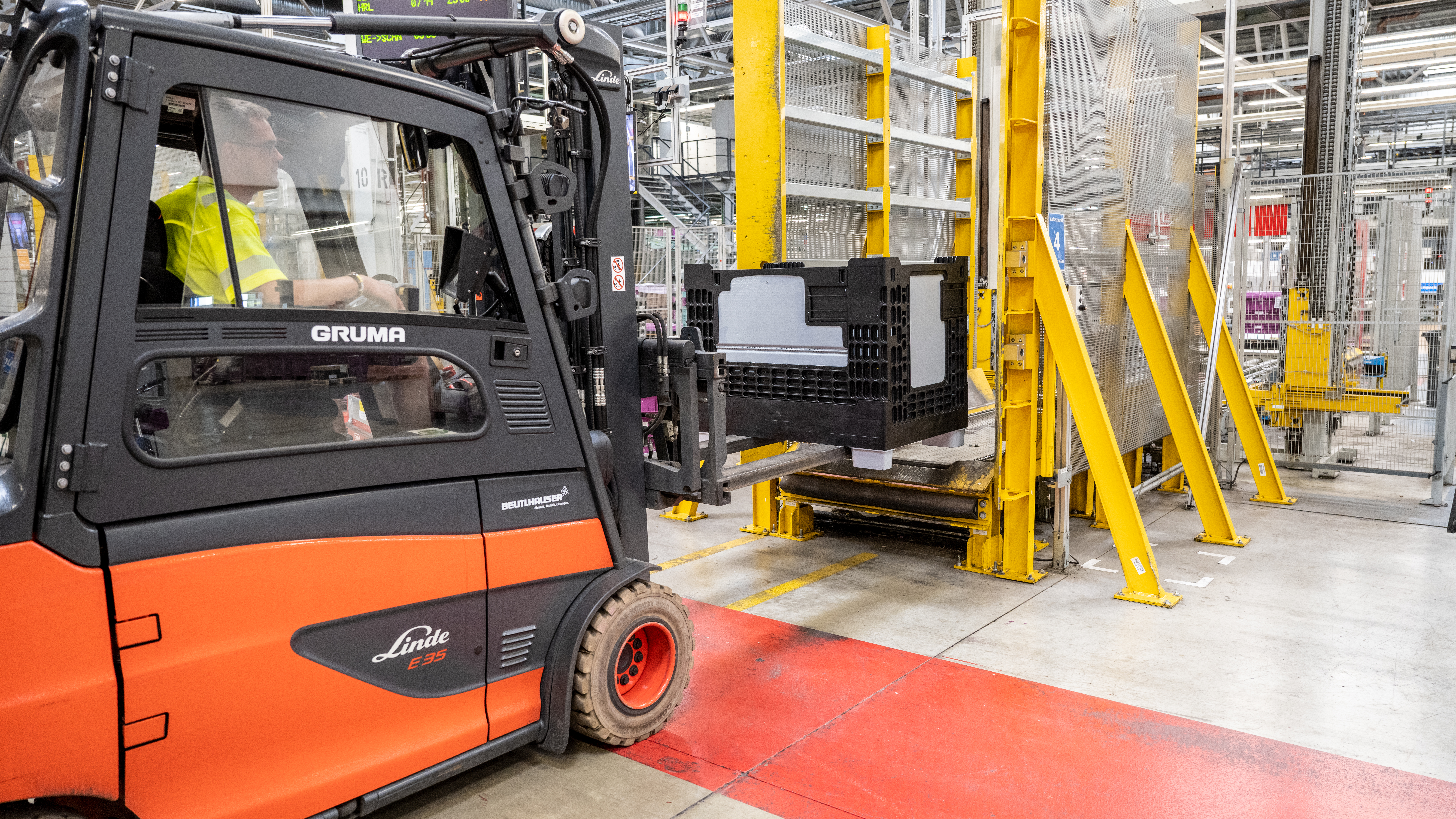 The BMW Group is introducing something that will have an even greater impact on emissions: folding large load carriers. As of this year, instead of pallet cages made of steel, we will be using folding plastic alternatives made from over 90 percent recycled material. These work in a similar way to the collapsible shopping crates that most people are familiar with: when they are empty, they can be folded up, making them easier to transport. Using 15,000 of these new containers reduces CO2 by around 3,000 tons per year.