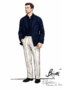 Pensée pour un environnement international et dynamique, la garde-robe allie polyvalence et qualité dans le temps. Elle comprend notamment des blazers et pièces légères, tous créés pour que l’équipe évolue avec assurance et élégance tout au long de la saison. Au cœur de cette sélection, l’emblématique Soffio Blazer : une veste croisée déstructurée, non doublée, en cachemire hopsack léger, conçue dans une quête de légèreté tout en illustrant l’engagement de Brioni en faveur de l’élégance naturelle et de matières d’exception.