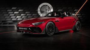 De nombreux autres détails de conception rendent également hommage au sport automobile. Les deux arcs-boutants derrière les sièges rappellent les voitures de course légendaires telles que la 300 SLR, avec laquelle Stirling Moss et Denis Jenkinson ont remporté les Mille Miglia 1955 en Italie – avec une vitesse moyenne record de 157 km/h sur la voie publique.