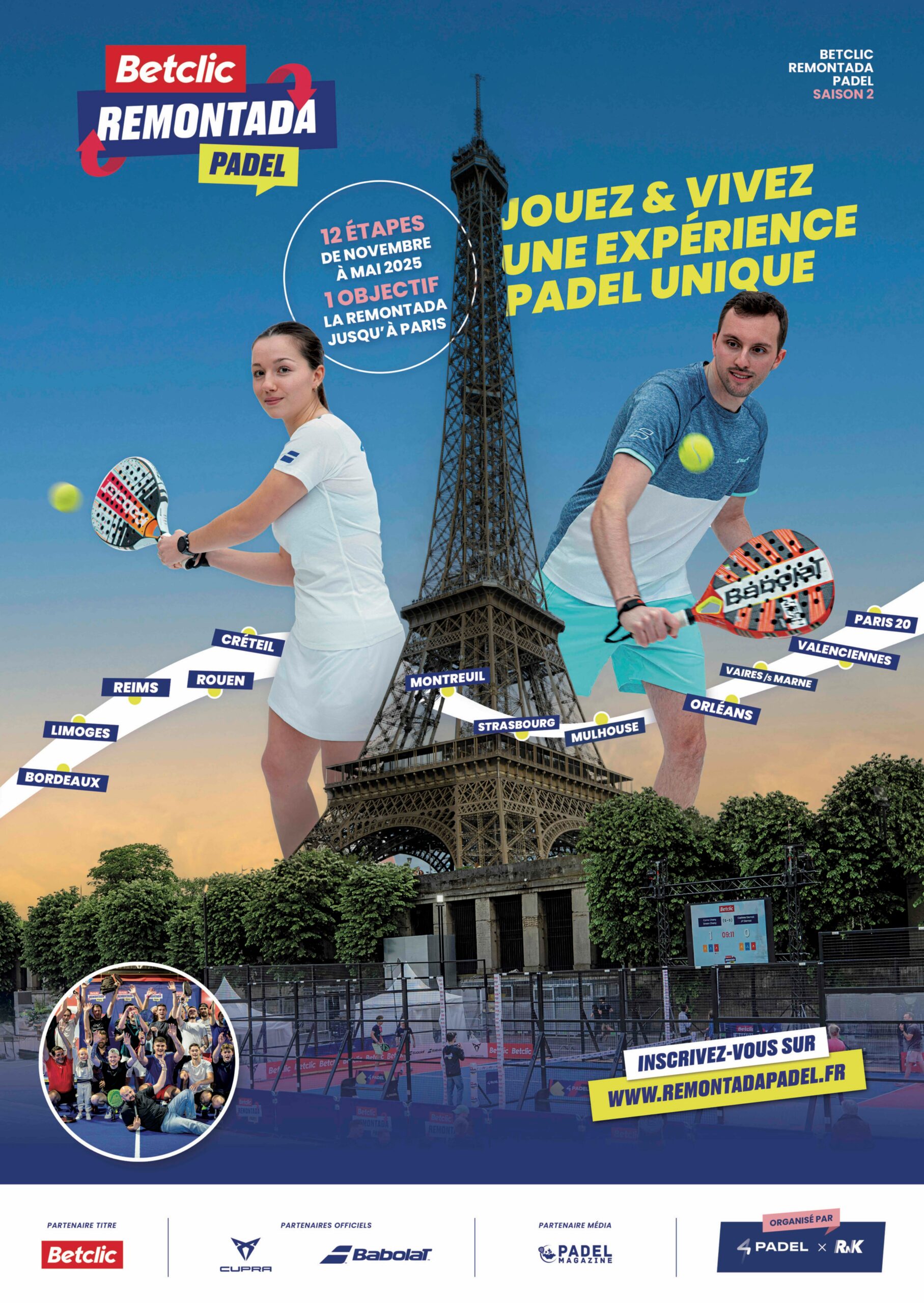 Lancée en 2024, la « Betclic Remontada Padel » est un circuit amateur national soutenu par CUPRA France. Organisée dans 12 centres 4PADEL à travers la France, la compétition séduit par son format accessible et ses règles « gamifiées », qui offrent une expérience à la fois ludique, compétitive et innovante. Avec plus de 3 000 participants dès sa deuxième édition, elle s’impose comme un rendez-vous incontournable pour les passionnés de padel.