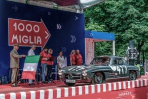 L’histoire de cette course de mille kilomètres est étroitement liée à Mercedes-Benz. La victoire de Rudolf Caracciola et Wilhelm Sebastian est légendaire. Ils sont devenus la première équipe non italienne à remporter les Mille Miglia en 1931 – avec la Mercedes-Benz SSKL (W 06 RS). En 1955, Stirling Moss et Denis Jenkinson ont remporté la victoire au volant d’une Mercedes-Benz 300 SLR (W 196 S). Leur performance inspire encore aujourd’hui de nombreux fans de sport automobile : le duo britannique a parcouru la distance en dix heures et sept minutes, à une vitesse moyenne d’un peu moins de 160 km/h, sur un parcours routier traversant notamment de nombreux cols de montagne. Ce record n’a jamais été battu. Étant donné que la dernière course a eu lieu en 1957, le record restera éternel. Lors de la course de 1955, les voitures de sport de série Mercedes-Benz 300 SL ont également gagné dans la catégorie Gran Turismo avec plus de 1,3 litre de cylindrée, et la 180 D (W 120) a remporté le classement des voitures de tourisme diesel.
