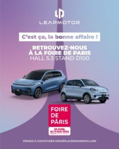 En pleine accélération, Leapmotor confirme son ambition de devenir un acteur clé de la mobilité électrique. Pour renforcer sa visibilité et aller à la rencontre du grand public, la marque sera présente à la Foire de Paris, premier événement de ce type en France, du 30 avril au 11 mai.