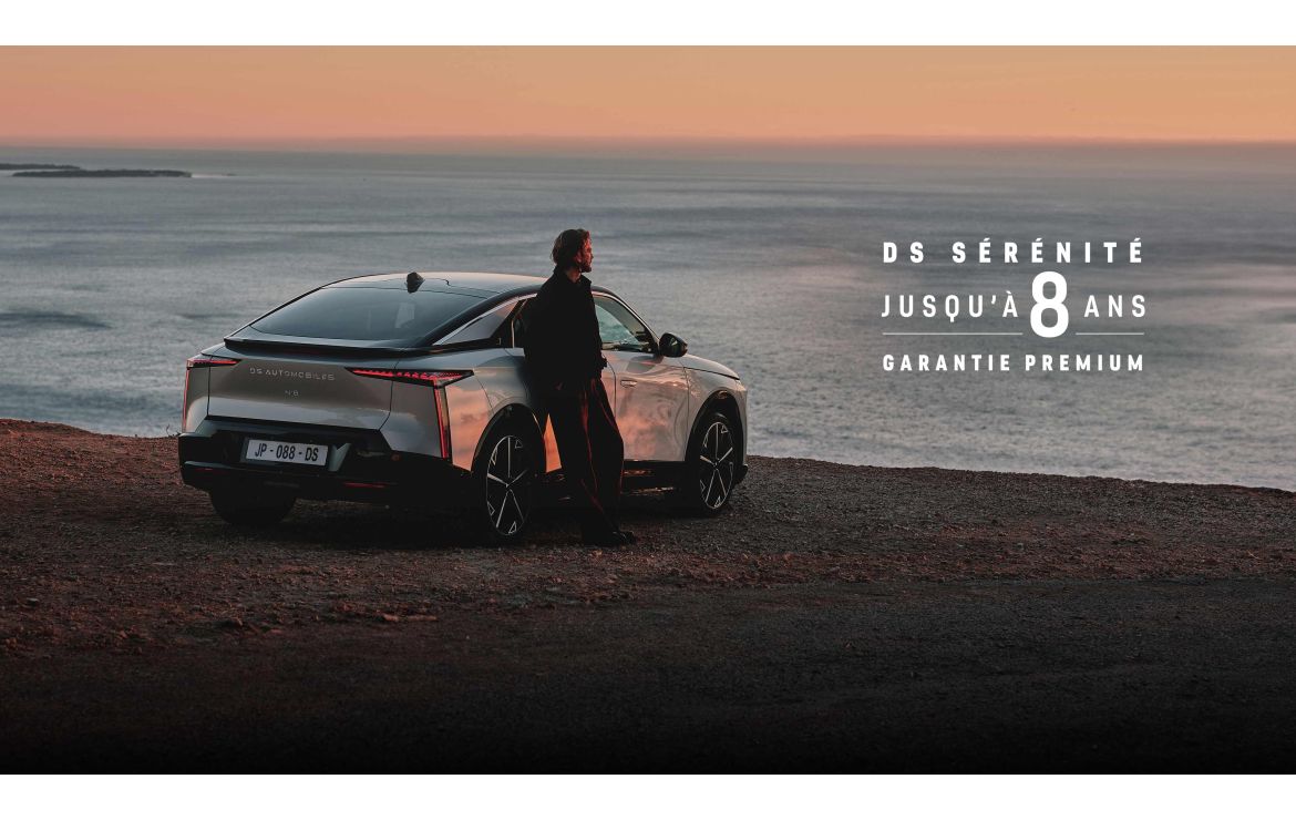 Sur les motorisations 100 % électrique E-TENSE, chaque entretien périodique effectué dans le réseau DS Automobiles active le programme de garantie premium DS sÉrÉnitÉ pour la durée menant au pas d’entretien suivant (soit 2 ans ou 25 000 km, dans la limite de 8 ans incluant la garantie Constructeur initiale ou 160 000 km). DS SÉRÉNITE vient s’ajouter à la garantie Constructeur offerte sur les batteries, qui est de 8 ans ou 160 000 km. L’ensemble du véhicule (moteur électrique, chargeur, groupe motopropulseur, principaux composants électriques et mécaniques et système d’info-divertissement) peut être ainsi couvert.