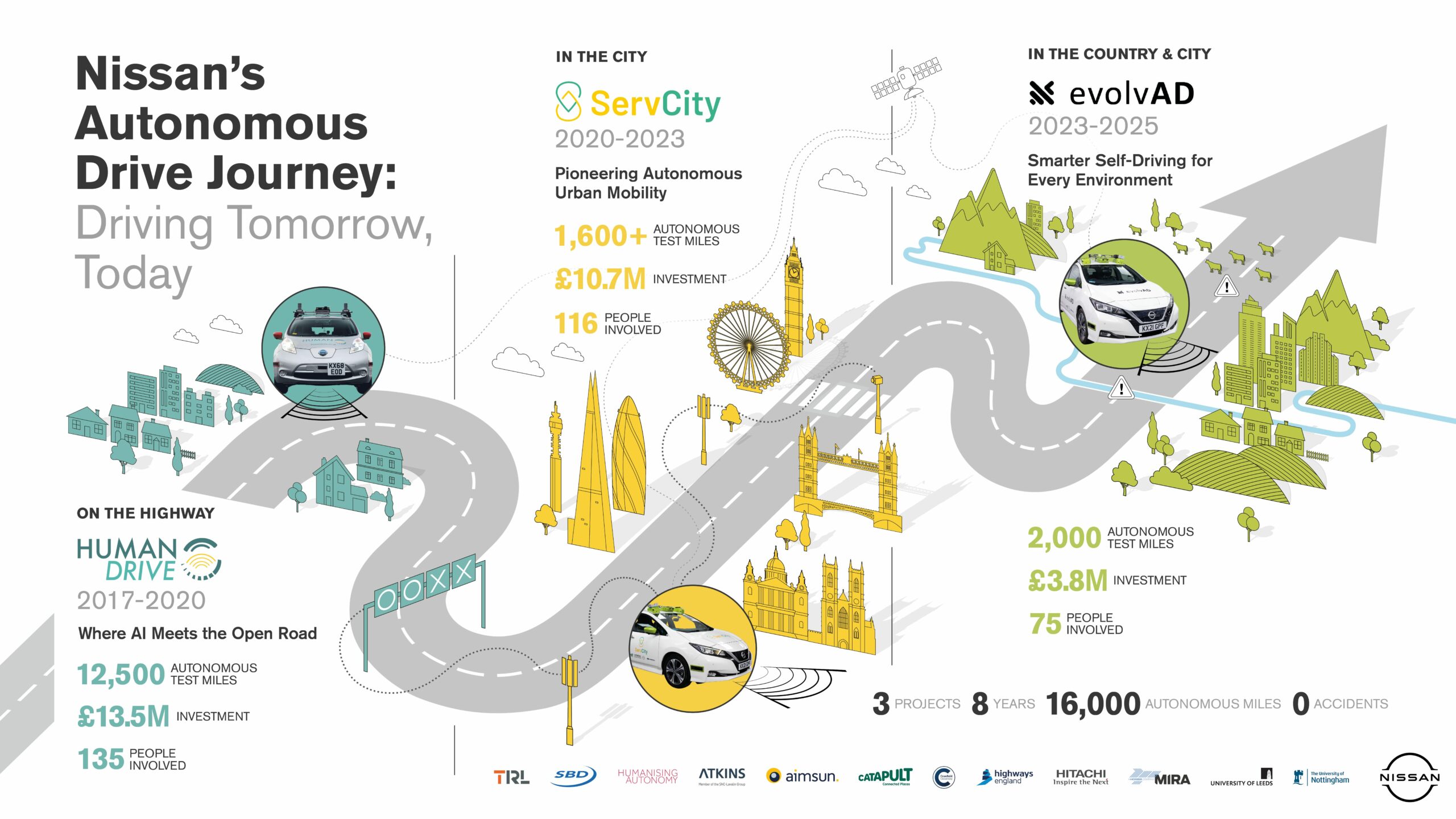 Mené par un consortium de cinq partenaires, avec Nissan comme chef de file technique, evolvAD a été cofinancé par le gouvernement et les partenaires du consortium. Le fonds « Intelligent Mobility » de 100 millions de livres sterling du gouvernement est administré par le Centre for Connected and Autonomous Vehicles (CCAV) et déployé par l’agence d’innovation du Royaume-Uni, Innovate UK.
