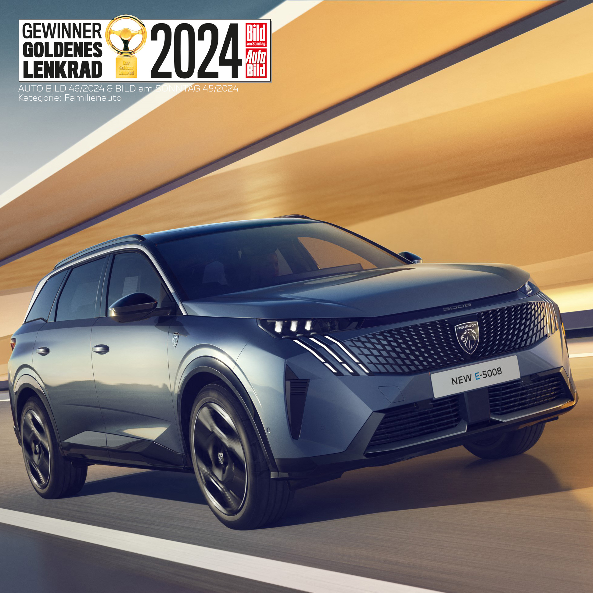 Le nouveau PEUGEOT E-5008 a été honoré par le prix « Golden Steering Wheel » de cette année décerné par Axel Springer Verlag. Le modèle de voiture familiale a impressionné les lecteurs des magazines AUTO BILD et BILD am SONNTAG ainsi qu’un jury d’experts. Tous les gagnants seront annoncés dans les numéros 46/2024 de ‘AUTO BILD’ et 45/2024 de ‘BILD am SONNTAG’.