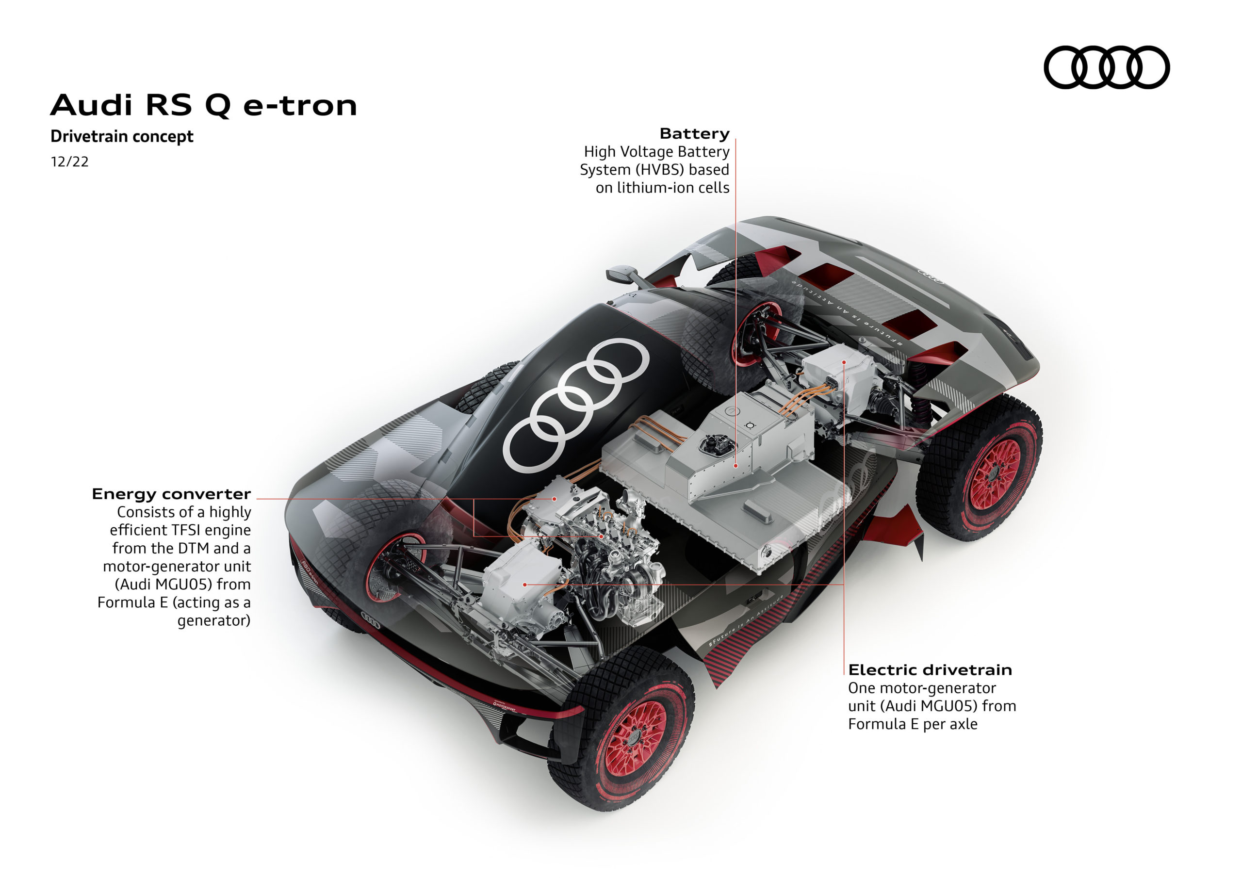 L’Audi RS Q e-tron dispose d’une chaîne cinématique électrique avec un convertisseur d’énergie. Elle se compose d’un moteur à combustion interne et d’un générateur, ainsi que d’une batterie haute tension et de deux moteurs électriques, un sur l’essieu avant et un sur l’essieu arrière. En 2023, Audi utilisera pour la première fois un carburant durable lors du Rallye Dakar. Ce carburant permet d’économiser plus de 60 % des émissions de dioxyde de carbone.