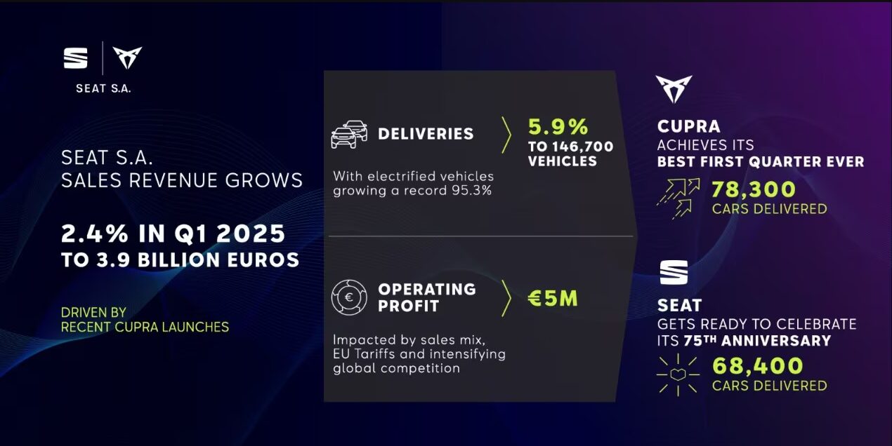 LE CHIFFRE D’AFFAIRES DE SEAT S.A. AUGMENTE DE 2,4 % AU PREMIER TRIMESTRE 2025 POUR ATTEINDRE 3,9 MILLIARDS D’EUROS, PORTÉ PAR LES LANCEMENTS RÉCENTS DE CUPRA