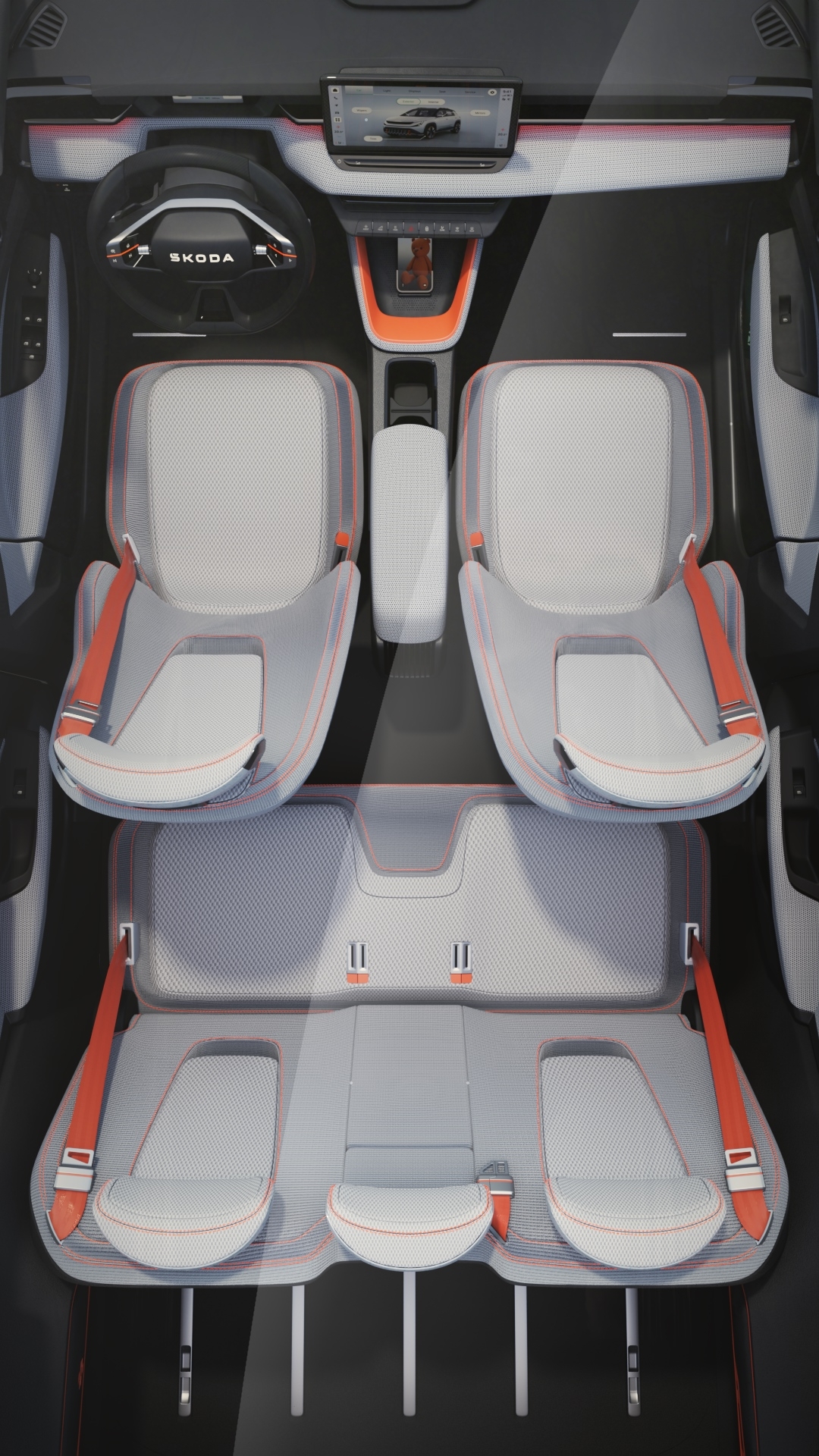 La Škoda Epiq sera le premier modèle de série à être doté d’un intérieur minimaliste issu du « Modern Solid », qui met l’accent sur des matériaux durables. Il dispose d’un compartiment de rangement ouvert qui comprend un espace de recharge des smartphones par induction dans la console centrale flottante, ainsi que des compartiments « Simply Clever » pour le rangement. Le coffre bénéficie également de certains détails Simply Clever chers au constructeur, tels que des crochets pour sacs, des éléments de chargement, des crochets de fixation et un compartiment caché sous le plancher. Le volant à deux branches arbore le nouveau lettrage Škoda ainsi que des boutons physiques et des molettes de défilement haptiques aux accents orange flashy pour contrôler les fonctions clés pendant la conduite. La connectivité du véhicule permet de nombreuses interactions via le smartphone du client, améliorant ainsi l’expérience numérique de l’utilisateur. Comme toujours, Škoda adopte une approche très orientée client pour faciliter le quotidien des utilisateurs. Le Škoda Epiq intègre également la recharge bidirectionnelle, transformant la voiture en une unité de stockage d’énergie roulante qui peut injecter l’énergie électrique excédentaire dans la maison du client et vers d’autres appareils.