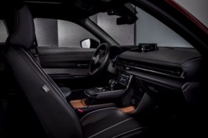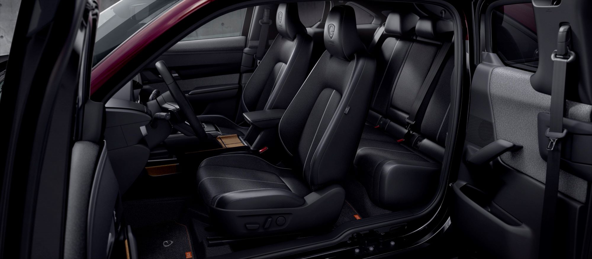 La version dévoilée au salon de l’automobile de Bruxelles est l’Edition R – une édition spéciale qui sera disponible lors de la commercialisation du MX-30 e-Skyactiv R-EV. Cette série limitée bénéficie d’une finition exclusive Jet Black – Maroon Rouge au niveau de ses arches de toit – laquelle fait directement écho à la couleur rouge du toit de notre tout premier véhicule de tourisme, la Mazda R360 Coupé. Le reste de la carrosserie de même que l’intérieur reçoivent quant à eux une finition noire. Le MX-30 R-EV Edition R hérite également d’éléments de design exclusifs, tels qu’un logo en forme de rotor cousu sur les tapis de sol et frappé sur les appuis-tête des sièges.