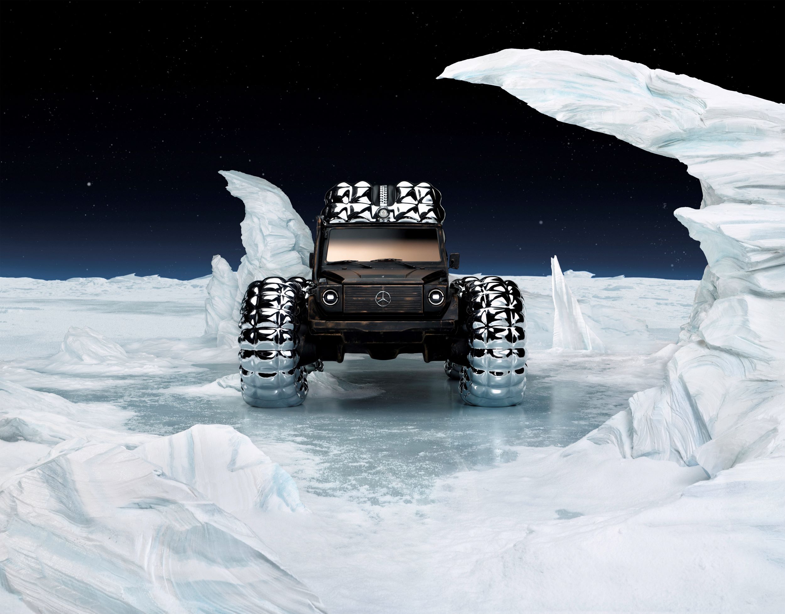 En plus de la Mercedes-Benz Vision One-Eleven, l’oeuvre PROJECT MONDO G fait également partie de Pebble Beach. Il combine les caractéristiques de la Mercedes-Benz Classe G avec la doudoune de Moncler dans le cadre de la collaboration entre les deux marques.