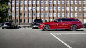 Le véhicule recherche en permanence des places de stationnement à des vitesses inférieures à 35 km/h et l’affiche sur l’écran du conducteur avec un symbole « P » bleu. Il peut également détecter des places de stationnement très étroites avec seulement 50 centimètres d’espace libre à chaque extrémité de la voiture et utilise des marquages blancs ou des structures parallèles telles que le trottoir ou d’autres véhicules garés pour s’orienter. Lorsque la Mercedes trouve une place, une flèche blanche apparaît à l’écran à côté du symbole « P ». Après avoir enclenché la marche arrière, le conducteur peut sélectionner l’espace de stationnement et démarrer le processus de stationnement automatisé. Pour des places de stationnement perpendiculaires, le conducteur peut choisir de se garer en avant ou en arrière.