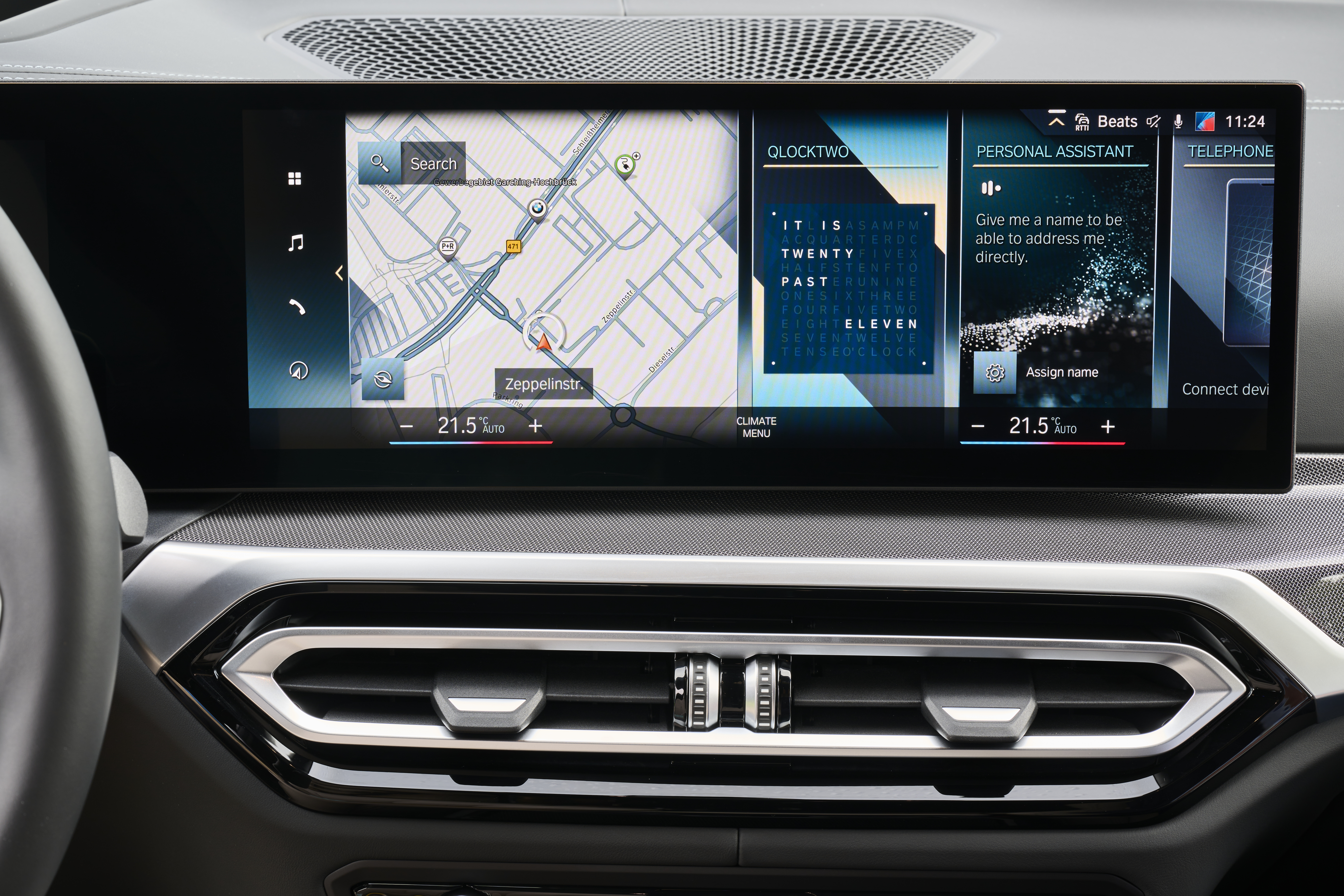 QLOCKTWO est un affichage de l’heure qui a remporté plusieurs prix pour son design exceptionnel. Il indique l’heure à l’aide d’une matrice de mots qui change toutes les cinq minutes. Des points lumineux légèrement éclairés aux coins de la matrice indiquent les minutes intermédiaires. Comme BMW, QLOCKTWO réussit à combiner un design de haute qualité avec un savoir-faire luxueux. La dernière mise à jour logicielle à distance rend QLOCKTWO disponible en 16 langues au total pour tous les modèles BMW équipés de l’OS 8.0. Le widget utilise automatiquement la langue sélectionnée dans les paramètres de l’OS. Les conducteurs peuvent ajouter le nouveau widget en faisant simplement glisser les éléments existants dans le menu principal vers la gauche, puis en sélectionnant « Ajouter un widget”.