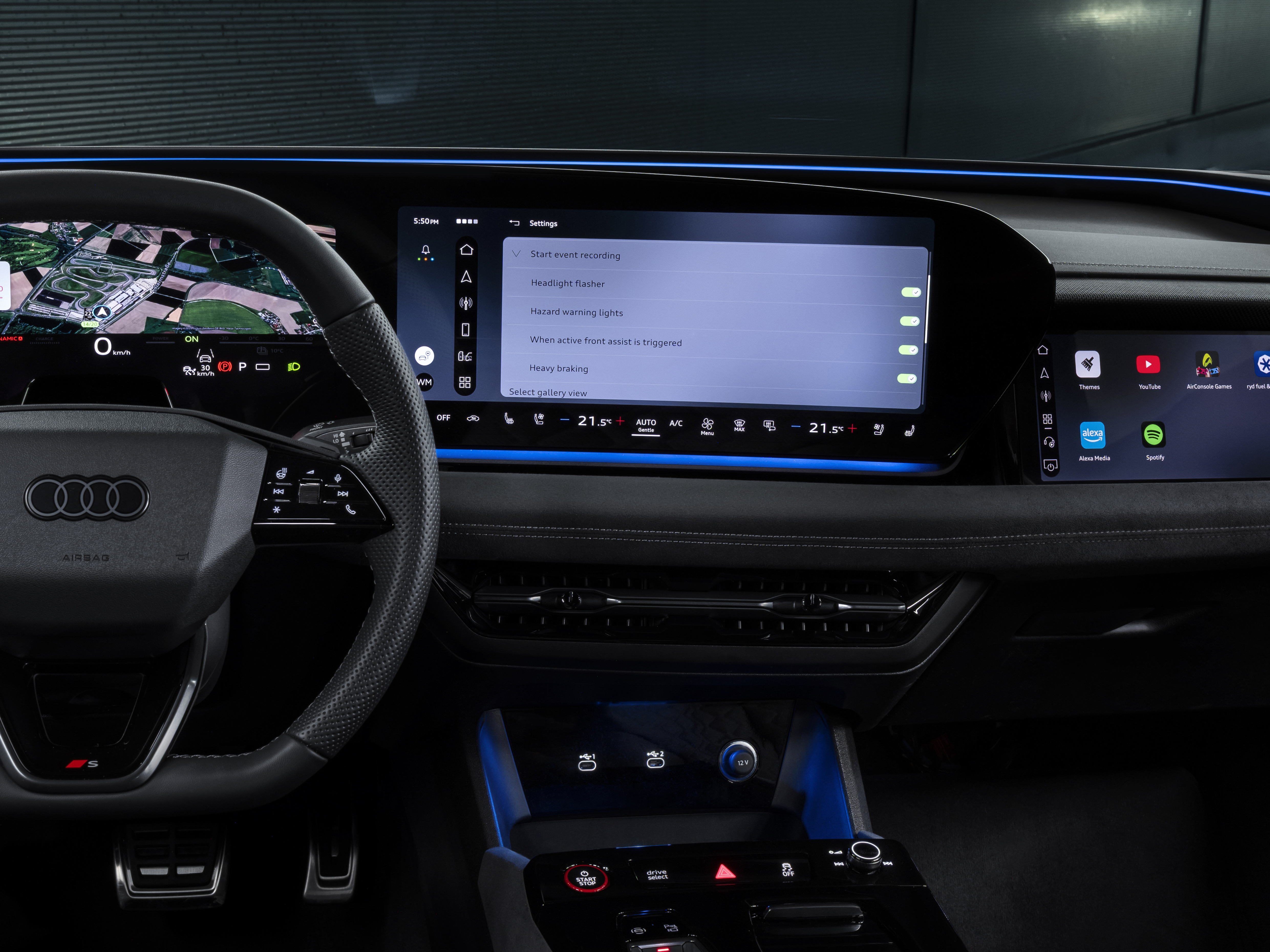 L’activation du mode dynamic plus modifie également automatiquement l’affichage dans le système d’information du conducteur et dans l’affichage tête haute. Dans le modèle à combustion, un compte-tours central avec témoin de changement de rapport et indicateur de vitesse est affiché ; tandis que dans le modèle électrique, un indicateur de puissance est affiché à la place. De plus, l’assistant Audi drive select sera également disponible. Lorsqu’elle est activée, cette fonction ajuste automatiquement le mode drive select en fonction du style de conduite individuel du conducteur et de la situation de conduite respective.