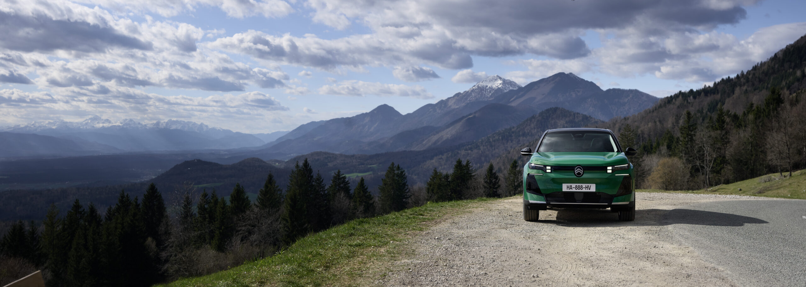 Sa face avant exprime de la force et de la fluidité. Elle accueille en son centre le nouveau logo Citroën qui s’affiche fièrement. La nouvelle signature lumineuse Citroën à 3 points est ici interprétée avec des segments horizontaux particulièrement fins qui soulignent l’élégance de la partie avant et renforcent l’expression de largeur de la voiture. Les projecteurs Citroën Matrix LED sont reliés par un bandeau noir brillant, chic et discret. Autre élément de distinction et souci du détail, les stries moulées dans le bouclier qui viennent animer une surface plane et font échos aux motifs de la calandre qui reprennent le thème des chevrons. L’ensemble dégage une expression très statutaire, mêlant modernité, technologie et caractère. A noter que sur la version électrique la partie avant est complètement fermée afin d’optimiser l’efficacité aérodynamique.