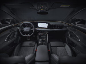 L’élément central de l’intérieur est la « scène numérique », qui est installée devant le conducteur et le passager avant sous la forme des écrans Audi MMI. Les écrans alignés sont intégrés à l’intérieur avec un ajustement parfait. L’écran panoramique Audi MMI mince et autonome présente un design incurvé dotée de la technologie OLED, et abrite le cockpit virtuel Audi de 11,9 pouces et l’écran tactile MMI de 14,5 pouces.