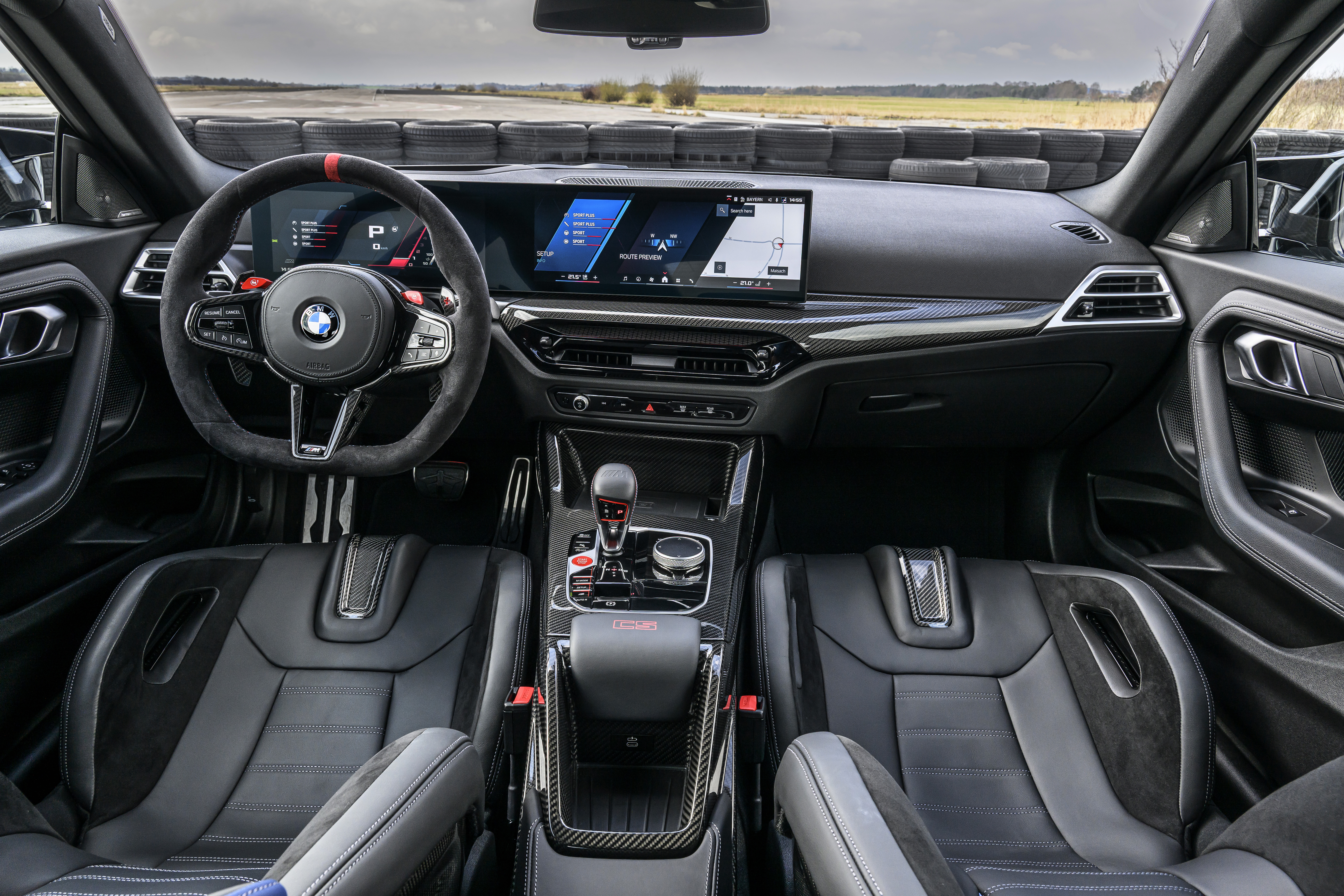 Le cockpit de la BMW M2 CS se concentre sur l’expérience de conduite exaltante, tout en combinant avec succès son ADN de course automobile grâce à des matériaux de haute qualité et des éléments de design exclusifs. La console centrale est fabriquée en plastique renforcé de fibres de carbone (CFRP). Le conducteur et le passager prennent place dans des sièges baquets M Carbon chauffants en cuir Merino, allégés et dotés de multiples réglages électriques, avec un logo « CS » illuminé. En plus de réduire considérablement le poids comparé aux sièges sport classiques, les sièges baquets sont également compatibles avec les ceintures multipoints. Le rembourrage de l’appui-tête peut être retiré pour laisser plus de place au casque et offrir des conditions idéales pour une utilisation sur circuit.