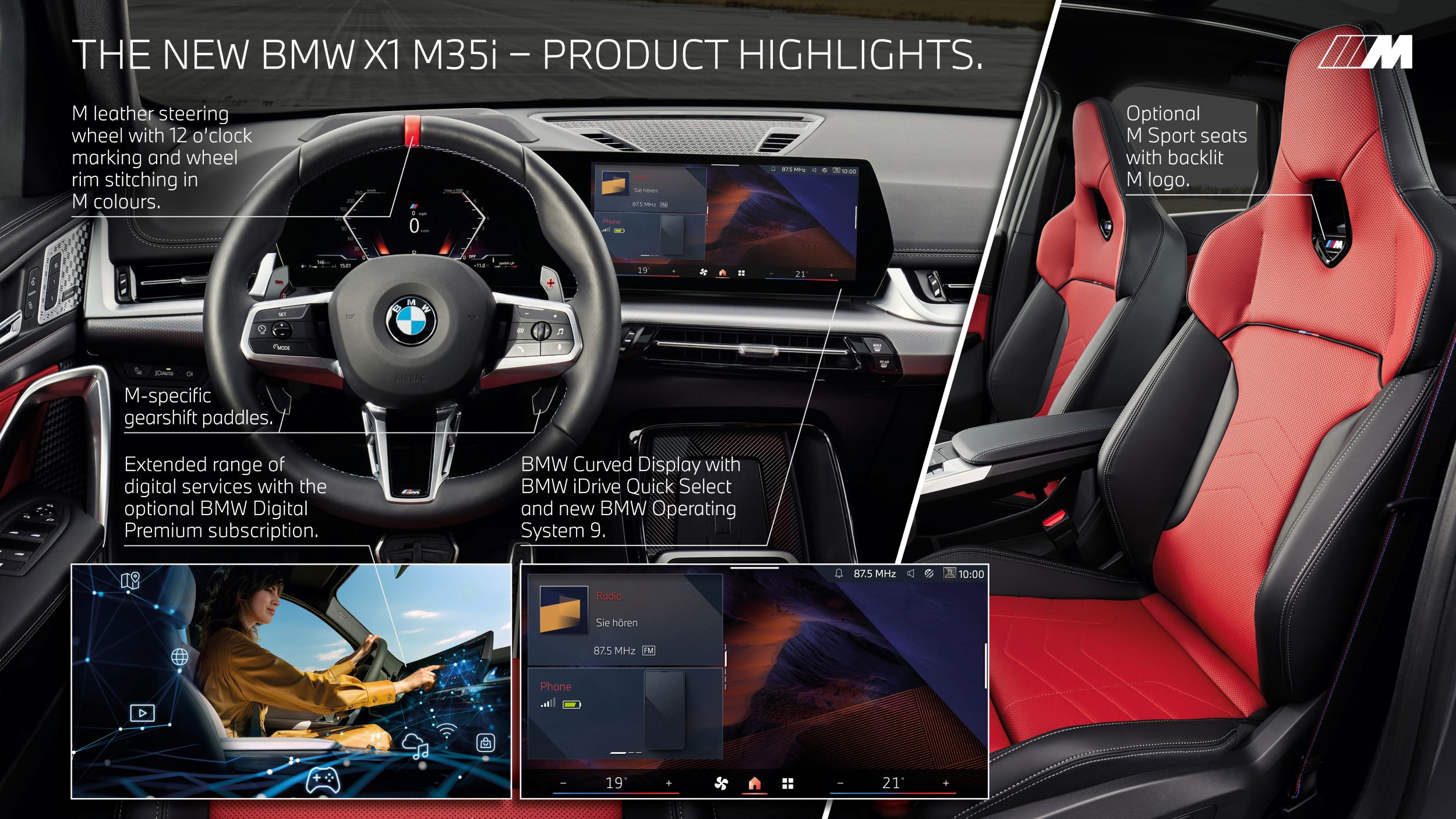 La nouvelle BMW X1 M35i xDrive est l’un des premiers modèles de la marque à être équipé de la version actualisée du système d’exploitation BMW iDrive avec QuickSelect et BMW OS 9. Afin de rendre la sélection et l’utilisation de nombreuses fonctions et services numériques encore plus intuitives et confortables, la dernière génération de BMW iDrive offre un écran d’accueil redessiné et la fonctionnalité QuickSelect. La structure du menu a été améliorée et s’inspire des appareils électroniques grand public. En affichant les bonnes informations au bon endroit, le nouveau BMW iDrive améliore l’expérience de conduite concentrée et assurée de la voiture.