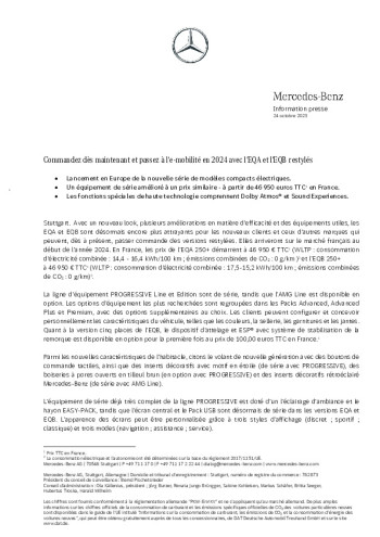 Avec un nouveau look, plusieurs améliorations en matière d’efficacité et des équipements utiles, les EQA et EQB sont désormais encore plus attrayants pour les nouveaux clients et ceux d’autres marques qui peuvent, dès à présent, passer commande des versions restylées. Elles arriveront sur le marché français au début de l’année 2024. En France, les prix de l’EQA 250+ démarrent à 46 950 € TTC1 (WLTP : consommation d’électricité combinée : 14,4 – 16,4 kWh/100 km ; émissions combinées de CO2 : 0 g/km )[1] et l’EQB 250+ à 46 950 € TTC1 (WLTP : consommation d’électricité combinée : 17,5-15,2 kWh/100 km ; émissions combinées de CO2 : 0 g/km)2.