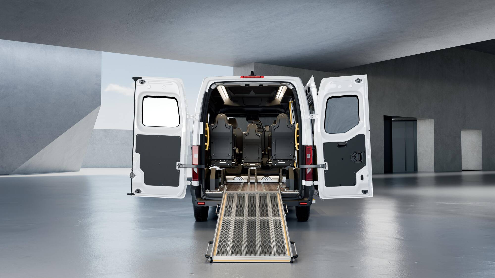 Deux moyens d’accès sont disponibles : une rampe manuelle et un hayon élévateur, garantissant simplicité et sécurité. Grâce à un large choix d’équipements, nos clients peuvent adapter leur véhicule selon leurs usages : sièges amovibles et rabattables, kit d’arrimage renforcé, marchepied électrique, climatisation et chauffage additionnel. L’intérieur a été revu avec des habillages stylisés, un plancher effet bois et un éclairage LED sur toute la longueur du compartiment passager, offrant une ambiance cosy et agréable.