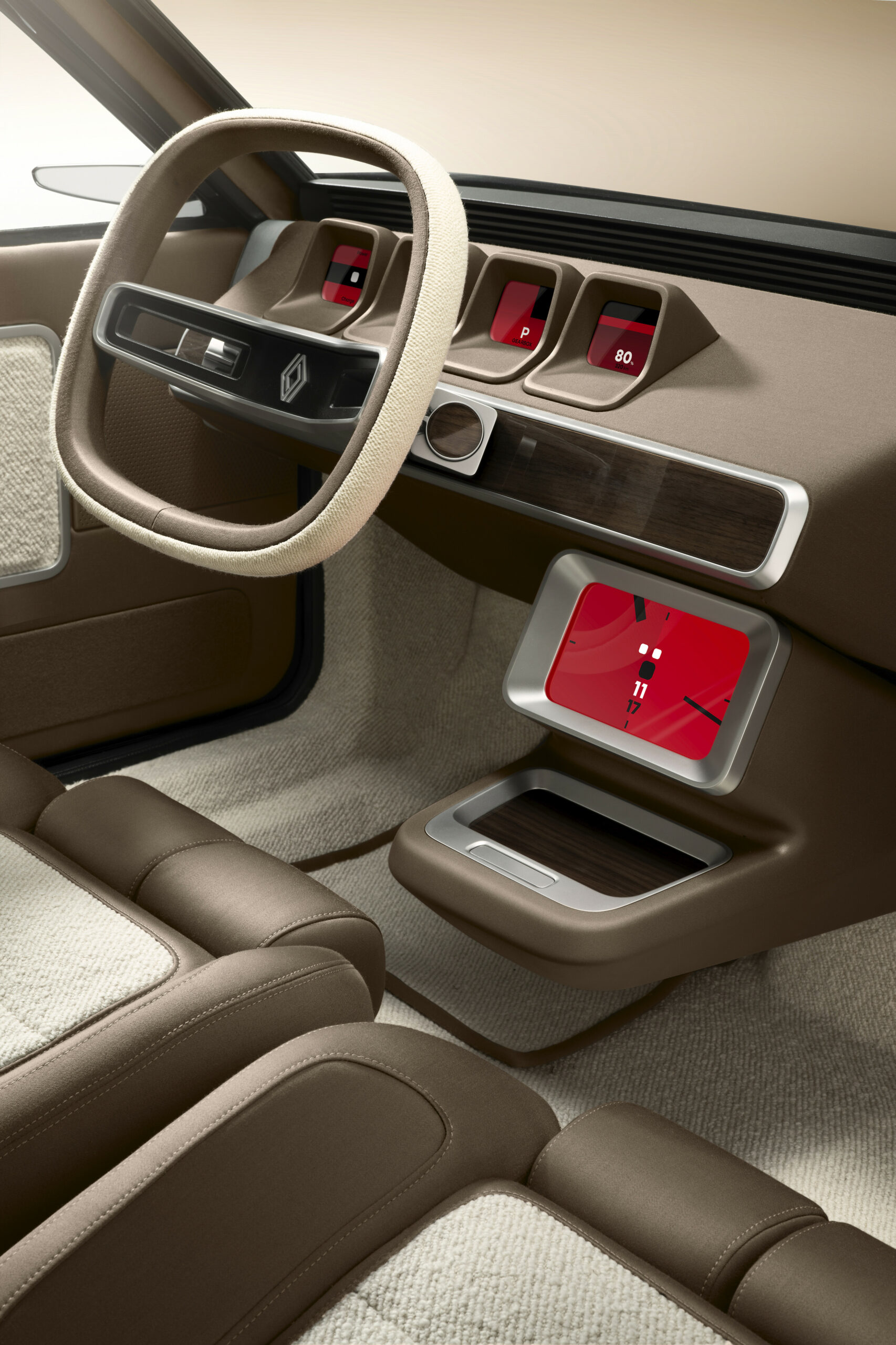 À l’intérieur, tel un véritable véhicule de tourisme, R17 se parait d’un poste de conduite adapté, de sièges confortables, d’équipements complets et affichait une finition soignée. La version restomod conserve cet univers confortable en intégrant des modifications sur la planche de bord et la console centrale d’origine. Les sièges, redessinés autour de la structure des sièges « pétales » d’origine, se parent de nouveaux tissus inspirés de l’ameublement : un satin chiné en laine Mérinos très fine pour le tissu marron et un bouclé de laine léger et délicat, haut et épais pour le tissu beige. Enfin, résolument contemporaine, R17 electric restomod x Ora Ïto est équipée d’un écran central intégrant l’environnement graphique Renault d’aujourd’hui et de quatre petits écrans géométriques derrière le volant renouvelant l’esprit des compteurs d’époque.