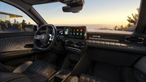 Renault 4 E-Tech electric sera proposée dans le courant de l’année en déclinaison Plein Sud dotée d’un toit ouvrant électrique en toile. Les larges dimensions (92 x 80 cm) de ce dernier permettent aux passagers arrière de bénéficier eux aussi de cette ouverture, sans que la garde au toit ne soit impactée.