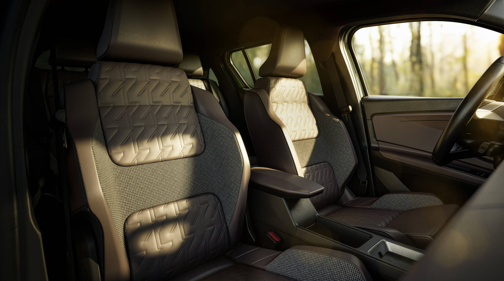L’intérieur se montre sophistiqué avec des sièges en tissu « textile refined » (TEP) Brun Profond. En haut de dossier, un motif matelassé ton sur ton, composé de chiffres 4, y ajoute une touche graphique. Un motif pied-de-poule complète avec chic les habillages de dossier ainsi que les renforts latéraux.