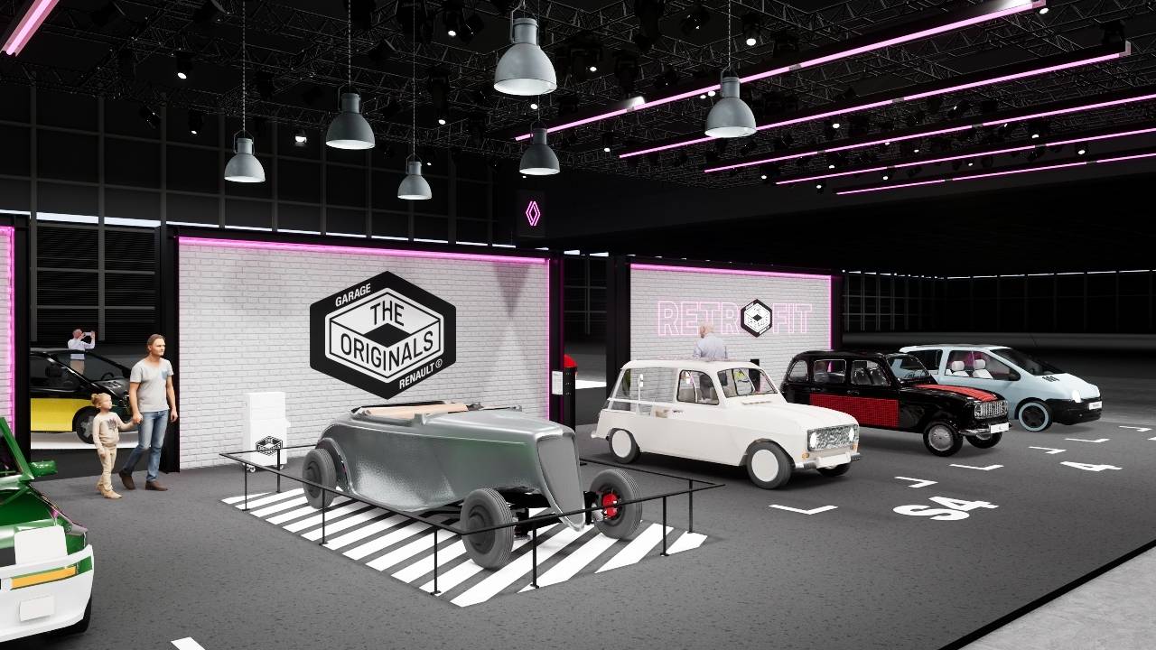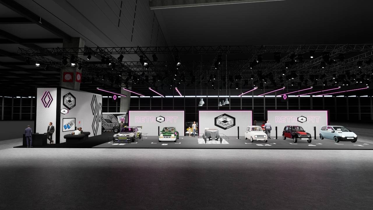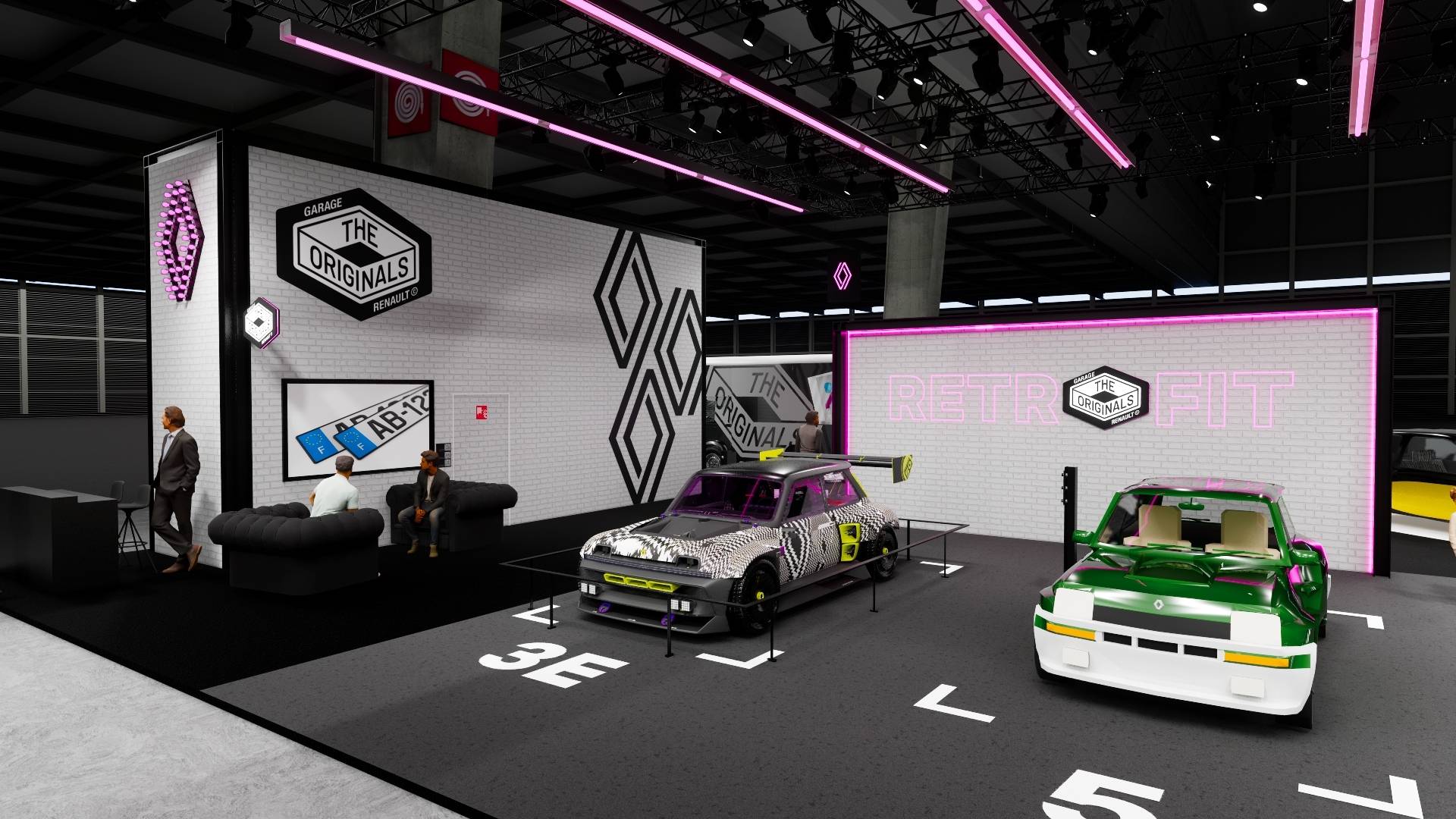 Une première zone nommée The Originals Renault Garage exposera trois modèles rétrofit 100 % électriques1 : Renault 4, Renault 5 et une Twingo revisitée dont ce sera la première apparition auprès du public. En effet, à l’occasion des 30 ans de Twingo, le Design Renault a poussé jusqu’au bout la logique du slogan « Twingo, à vous d’inventer la vie qui va avec » en proposant un hommage inattendu à une autre tendance automobile décalée des années 90’, les lowriders californiens.