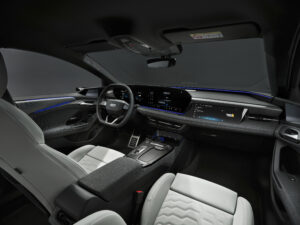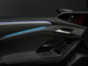 L’intérieur crée une ambiance conviviale. Le « soft wrap » s’étend de porte à porte sur toute la largeur du panneau, créant une sensation d’espace homogène et enveloppante. Les matériaux ont été choisis dans une perspective fonctionnelle. En même temps, ils assurent une différenciation claire du design des différentes zones de l’intérieur du véhicule. Les zones orientées vers le confort sont conçues avec des surfaces généreuses et des matériaux doux. En revanche, les zones de contrôle précisément conçues en noir brillant de haute qualité soulignent la clarté de l’interaction avec le véhicule. Les bouches d’aération minces et basses semblent disparaître en arrière-plan. Les écrans des rétroviseurs extérieurs numériques optionnels sont situés à l’intérieur des portes, bien visibles dans l’angle du montant A et du seuil de porte.