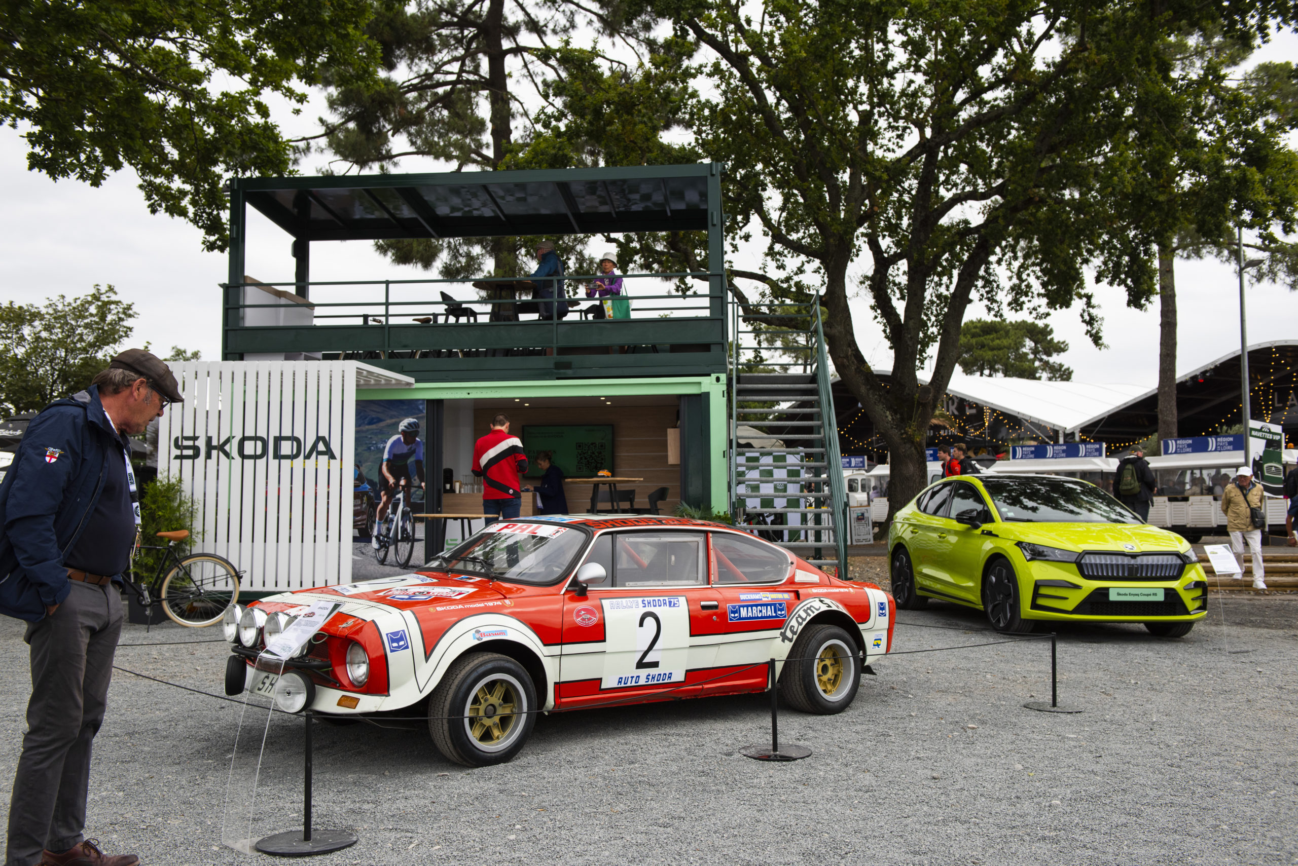 Škoda avait un dispositif durable et innovant avec un stand dans la partie Village, face au tunnel amenant à l’entrée principale autour duquel étaient exposées plusieurs icônes du constructeur tchèque. Il permettait de mettre en valeur les modèles et de recevoir, en bas et sur la terrasse surplombant le village, des clients du club Škoda et des invités de Škoda.