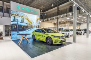 Le constructeur automobile tchèque avance également dans le déploiement de sa nouvelle identité corporate en Europe. Le premier concessionnaire à adopter ce nouveau design est Rohe Auto à Tallinn, en Estonie. Il sera également sous peu à Gosselies en Belgique, à Hamar en Norvège, à Wroclaw en Pologne, et à Prague en République Tchèque.