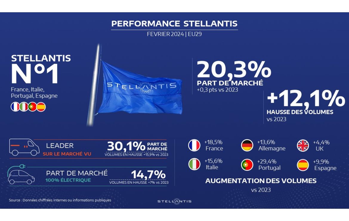 AMSTERDAM, le 8 mars 2024 – Stellantis confirme la tendance positive de ses ventes qui ont progressé tout au long de l’année 2023 et en janvier dernier. Sur le périmètre de l’UE29, Stellantis enregistre en février une augmentation de 12,1% de ses volumes de ventes VP+VU vs. février 2023, avec une part de marché s’établissant à 20,3%, en hausse de 0,3 points par rapport à 2023 et de 0,6 points par rapport à janvier 2024, ce qui porte la part de marché à 20% depuis le début de l’année.