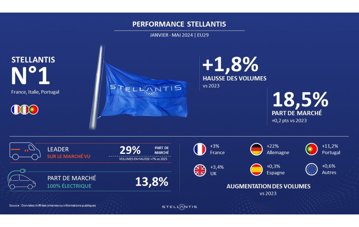AMSTERDAM, le 10 juin 2024 – Stellantis a enregistré une augmentation de 1,8% en volume (VP+VU) dans la zone EU29 au cours des cinq premiers mois de 2024, atteignant une part de marché de 18,5%, soit une augmentation de 0,2 point par rapport à 2023. L’entreprise est en tête en France, en Italie et au Portugal depuis le début de l’année, et en Espagne pour le mois de mai, avec une augmentation des ventes de 7,2%. La croissance notable des ventes depuis le début de l’année comprend 3% en France, 3,4% au Royaume-Uni, 0,3% en Espagne, 11,2% au Portugal et près de 22% en Allemagne, où sa part de marché est passée à 13,6%. Croissance à deux chiffres des ventes en Bulgarie, Croatie, en République tchèque, au Danemark, en Irlande et en Slovénie.