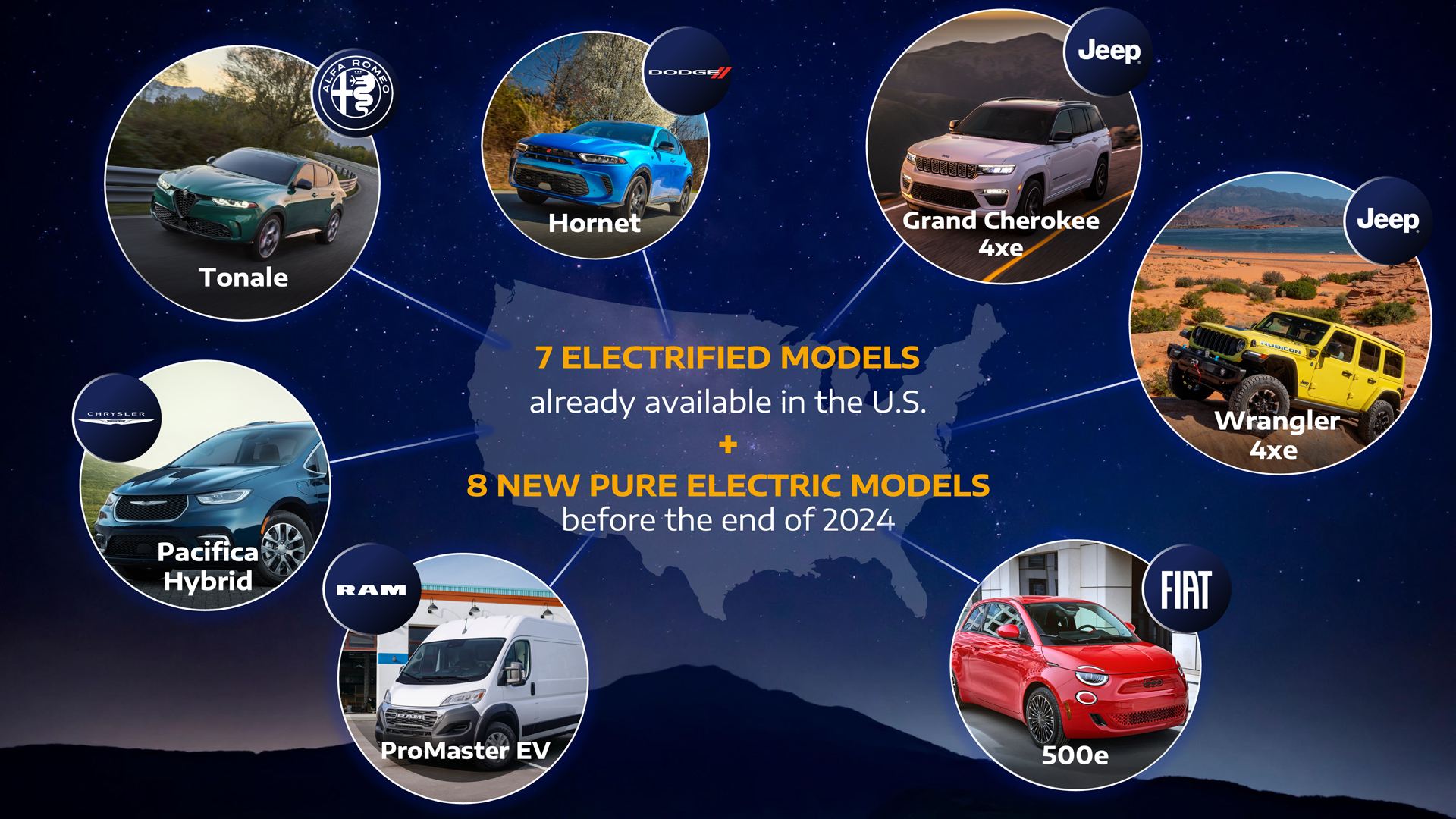 Stellantis commercialise actuellement cinq véhicules hybrides rechargeables aux États-Unis, avec les Jeep® Wrangler 4xe, numéro un des ventes, Jeep® Grand Cherokee 4xe, Chrysler Pacifica Hybrid, Dodge Hornet et Alfa Romeo Tonale. Deux véhicules 100 % électriques sont également disponibles, la FIAT 500e et le Ram ProMaster EV. L’entreprise prévoit de lancer cette année huit nouveaux modèles de véhicules électriques à batterie (BEV) aux États-Unis, pour atteindre son objectif de 48 modèles BEV à l’échelle mondiale d’ici la fin de l’année 2024.