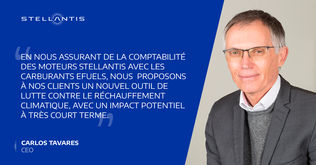 « Nous redoublons d’efforts pour lutter contre le réchauffement climatique en testant des carburants neutres en carbone comme solutions complémentaires afin de renforcer notre approche globale de décarbonation. Tout en restant déterminés à poursuivre notre stratégie en matière d’électrification, nous devons en parallèle trouver des solutions intelligentes pour réduire les émissions de CO2 des 1,3 milliard de véhicules thermiques existants, » a déclaré Carlos Tavares, CEO de Stellantis. « En nous assurant de la comptabilité des moteurs Stellantis avec les carburants eFuels, nous proposons à nos clients un nouvel outil de lutte contre le réchauffement climatique, avec un impact potentiel à très court terme. Cette action s’inscrit dans la continuité de notre engagement d’atteindre la neutralité carbone d’ici 2038. »