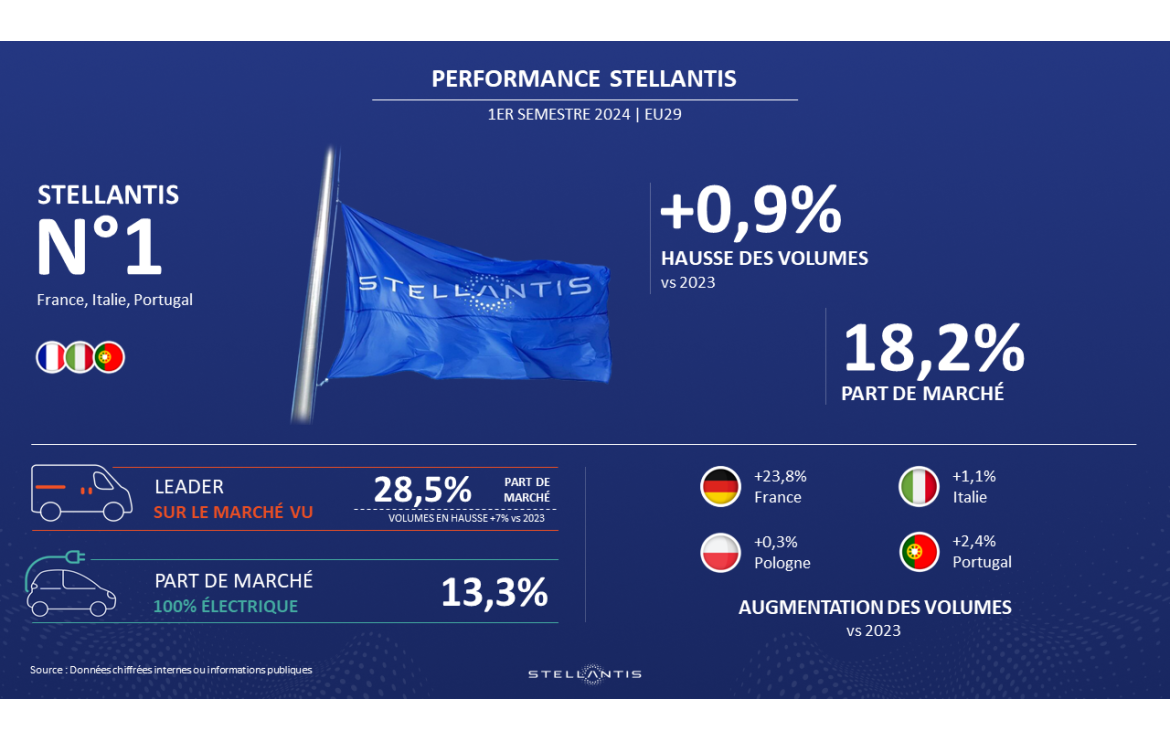 • Stellantis termine le premier semestre 2024 en croissance de 0,9% en volume en totalisant une part de marché de 18,2%
