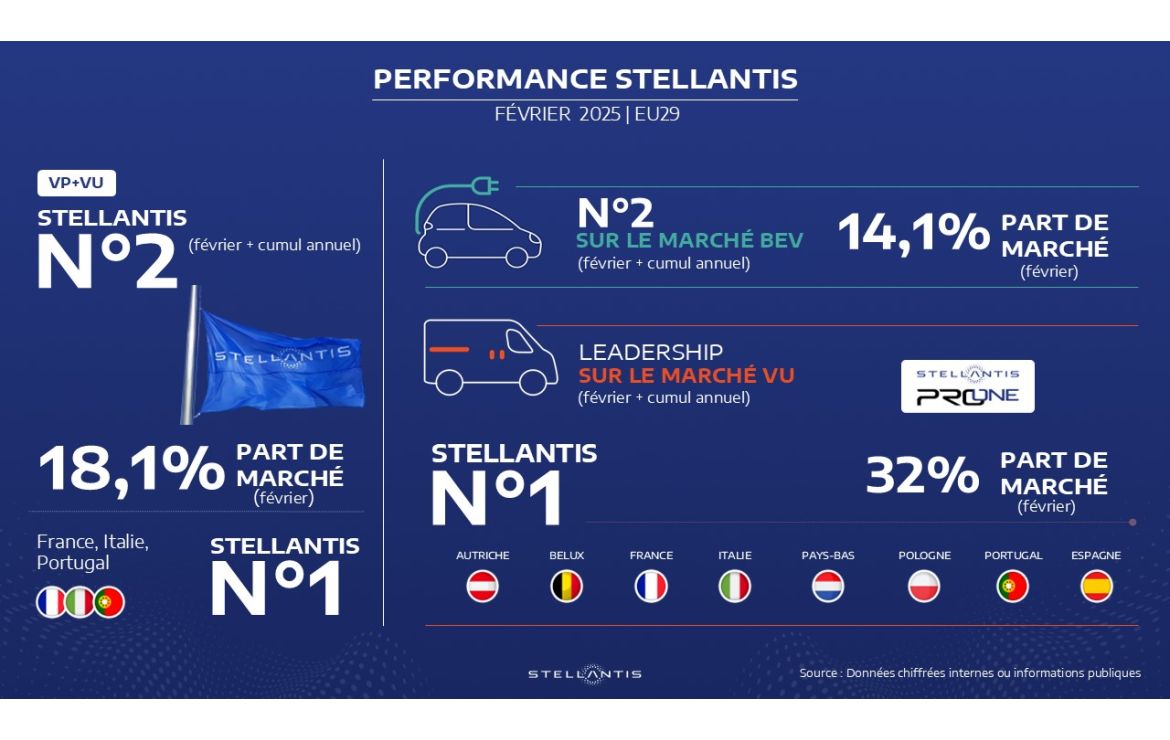 La famille Stellantis Pro One, qui regroupe les marques Citroën, , FIAT Professional, Opel/Vauxhall et PEUGEOT, confirme sa position de leader incontesté en Europe avec son meilleur résultat des 12 derniers mois : une part de marché de 32% (29,5% en janvier) et la première place sur 8 des 10 plus grands marchés : Autriche, Belux, France (40,4 % de part de marché depuis le début de l’année !), Italie, Pays-Bas, Pologne, Portugal et Espagne.