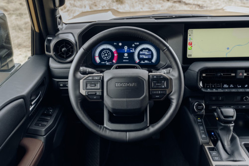 Les rembourrages des portes au niveau des genoux et des épaules offrent une protection supplémentaire sur les terrains difficiles. La partie supérieure du panneau de porte présente un profil échancré afin que le conducteur dispose d’un espace libre pour le mouvement de ses coudes. Le nouveau design du volant reflète le style extérieur solide et rassurant, avec de larges ouvertures pour éviter de se blesser aux doigts en cas de retour violent dans la direction. Le coussinet central porte le logo TOYOTA classique, et les commandes de différentes fonctions sont disposées de manière rationnelle sur les branches latérales.
