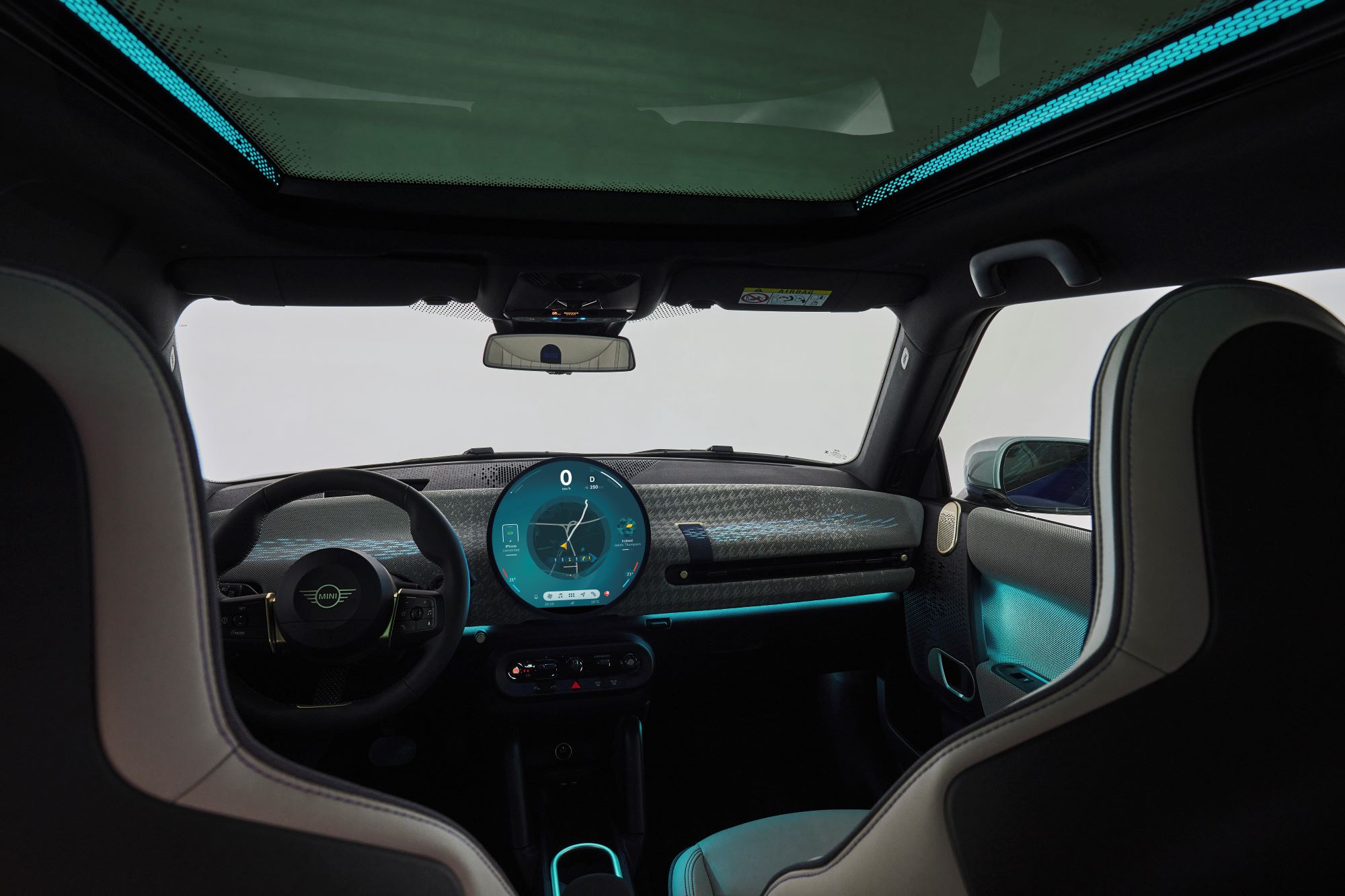 Le tableau de bord incurvé présente pour la première fois des surfaces textiles. Des matériaux agréables et chaleureux créent une nouvelle atmosphère accueillante et confortable à bord de la nouvelle MINI Cooper purement électrique. Un procédé de couture spéciale est utilisé pour créer ce textile résistant. Facile d’entretien, ce dernier arbore un design bicolore en polyester recyclé. L’intérieur se décline en différentes couleurs selon le niveau de finition choisi. Pour donner au tableau de bord une impression de légèreté et renforcer la sensation d’espace, les aérateurs horizontaux sont volontairement très fins et non plus circulaires comme dans la précédente génération.