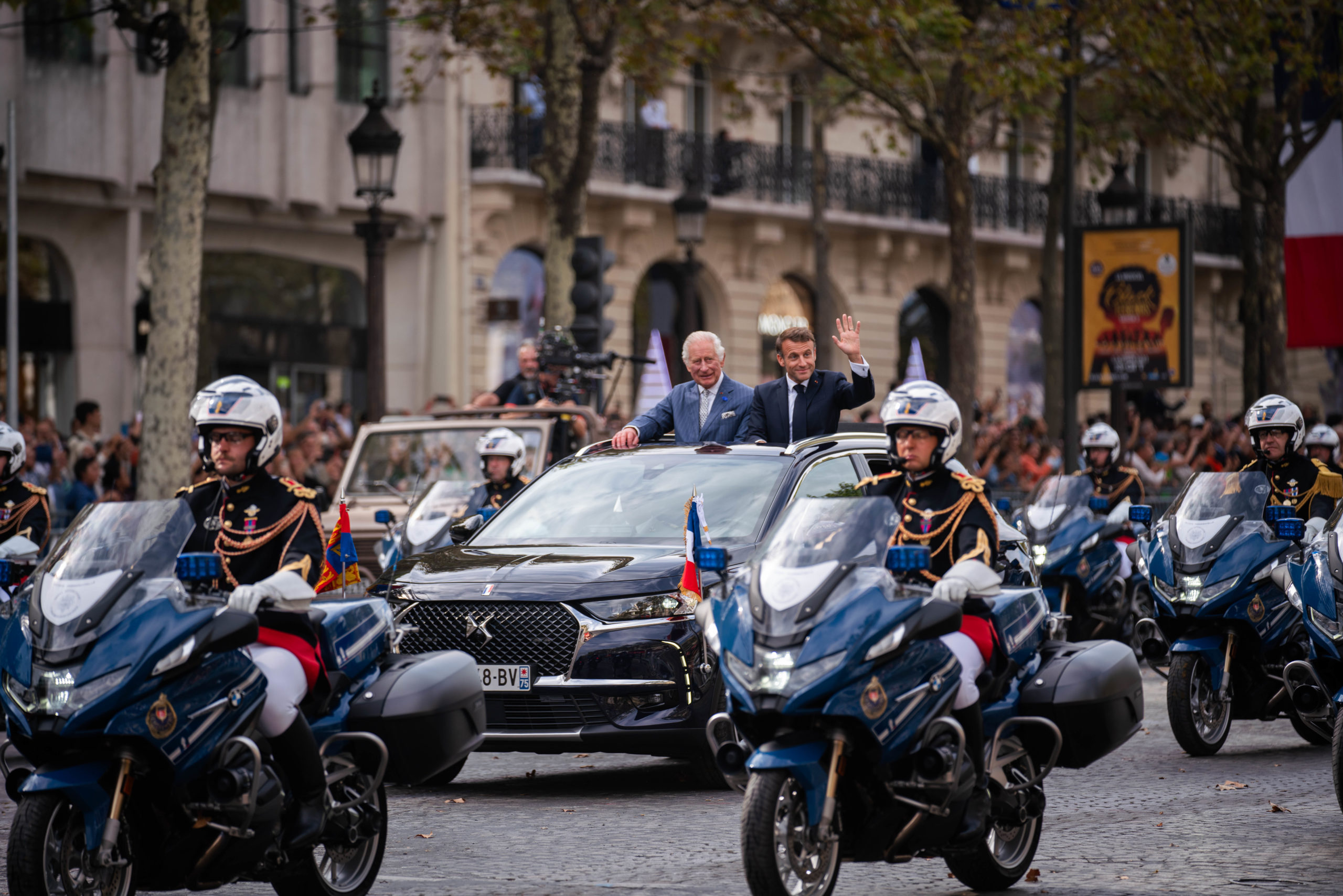 Accueillis devant l’Arc de Triomphe, Leurs Majestés le Roi Charles III et la Reine Camilla ont ensuite été invités au Palais de l’Elysée. La descente de l’emblématique avenue des Champs-Elysées s’est faite à bord de DS 7.